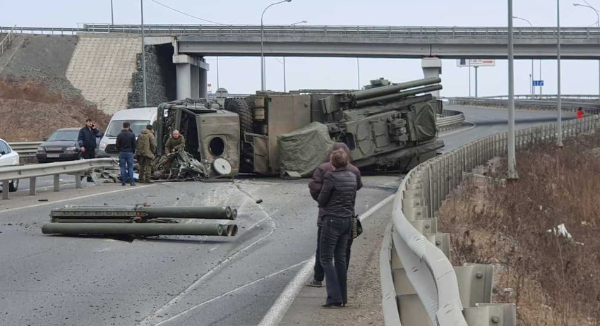 Военный автомобиль опрокинулся на трассе во Владивостоке, полностью перекрыв двухполосное движение в одну сторону. По предварительным данным, это зенитный ракетно-пушечный комплекс (ЗРПК) «Панцирь-С1» на базе КамАЗа.