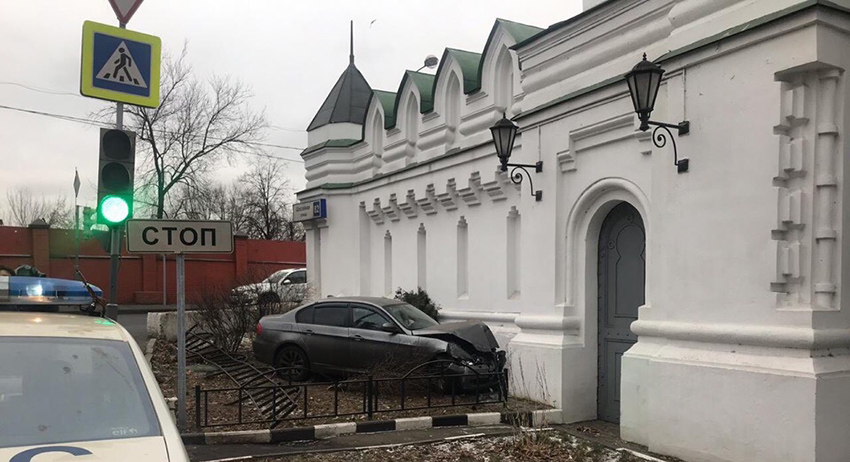 Полицейский на автомобиле BMW врезался в московский Николо-Перервинский монастырь на Шоссейной улице.