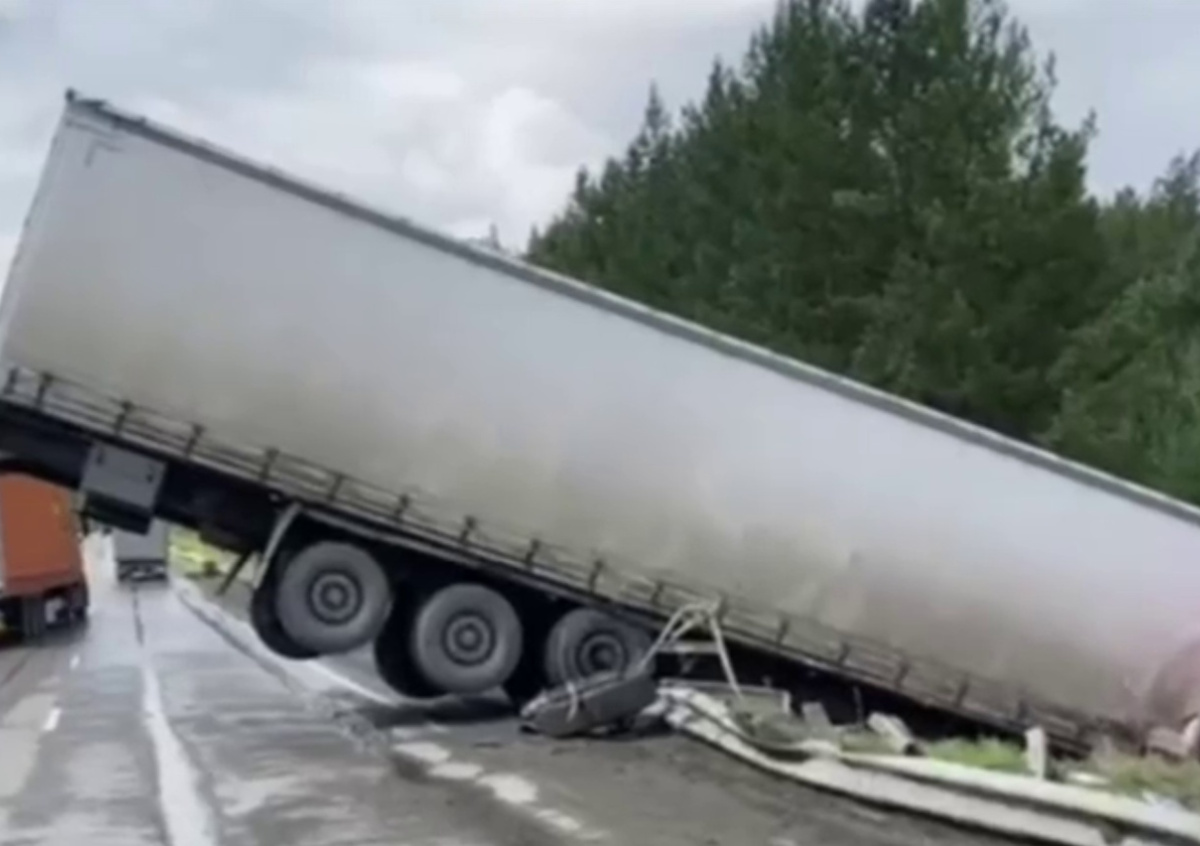 Повисшая на отбойнике фура под Челябинском попала на видео