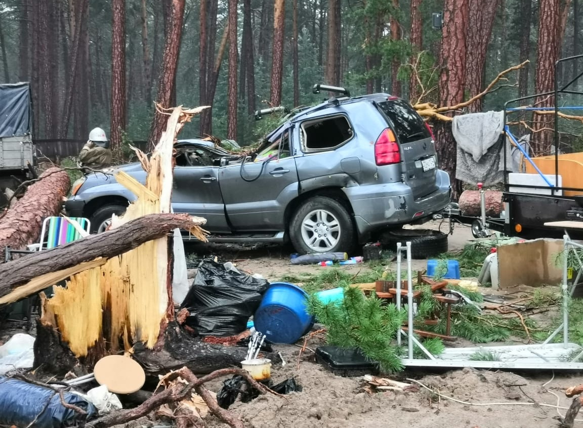 Сосны упали на палатки и машины отдыхающих. Были повреждены порядка 10 шатров и не менее 20 автомобилей, некоторые из которых восстановлению не подлежат. По разным данным, пострадали четверо или пятеро постояльцев лагеря, среди них есть 14-летний подросток. О жертве известно, что это 34-летняя женщина.