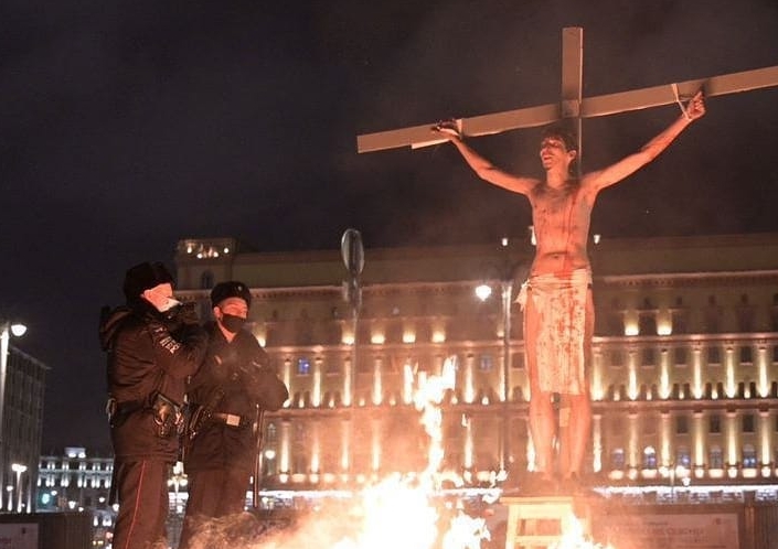 Акционист Павел Крисевич получил 15 суток административного ареста за изображение распятия Христа у здания ФСБ.