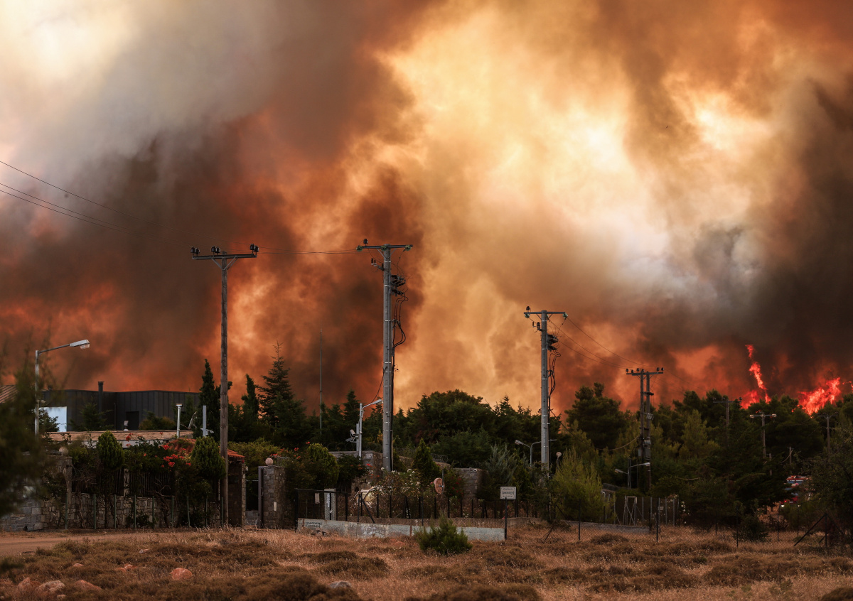 Греция: вид на лесной пожар, сжигающий район Дроссопиги, Варибоби, северо-восточный пригород Афин