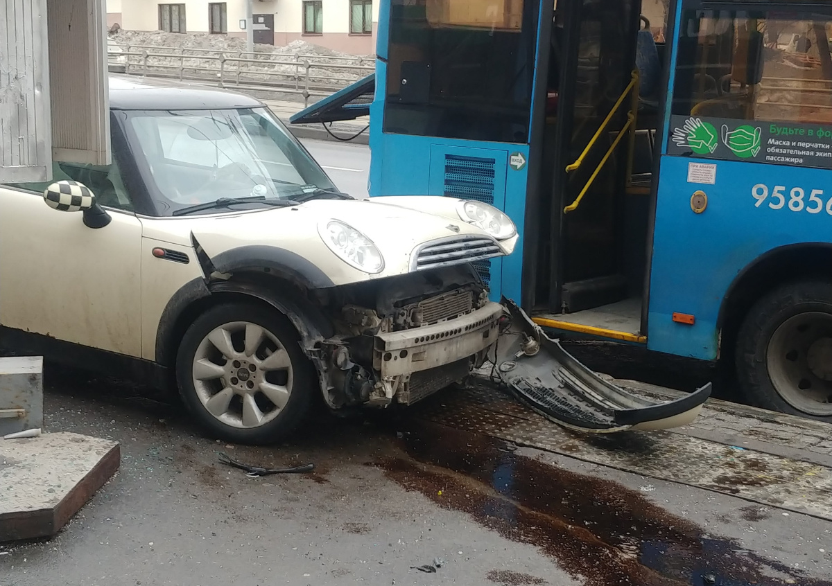 Водитель автомобиля «Мини Купер», не справившись с управлением, совершил столкновение с пассажирским автобусом, от удара по инерции иномарку отбросило на автобусную остановку, — говорится в сообщении столичной ГИБДД в Twitter.