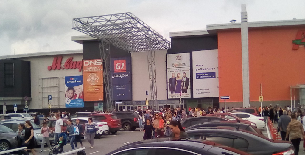 Находящийся внутри постройки магазин «Ашан» продолжает работать, однако выход из него в ТЦ перекрыт.