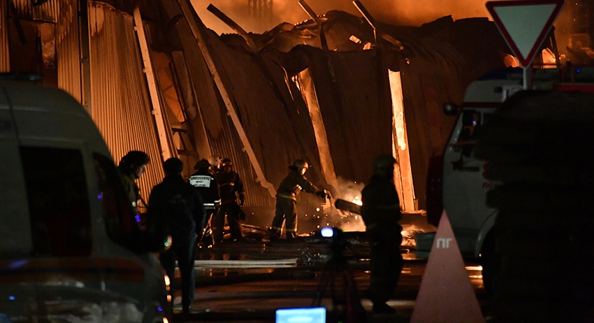 Склад загорелся в подмосковном городе Пушкино в Московской области. Произошло частичное обрушение кровли здания.