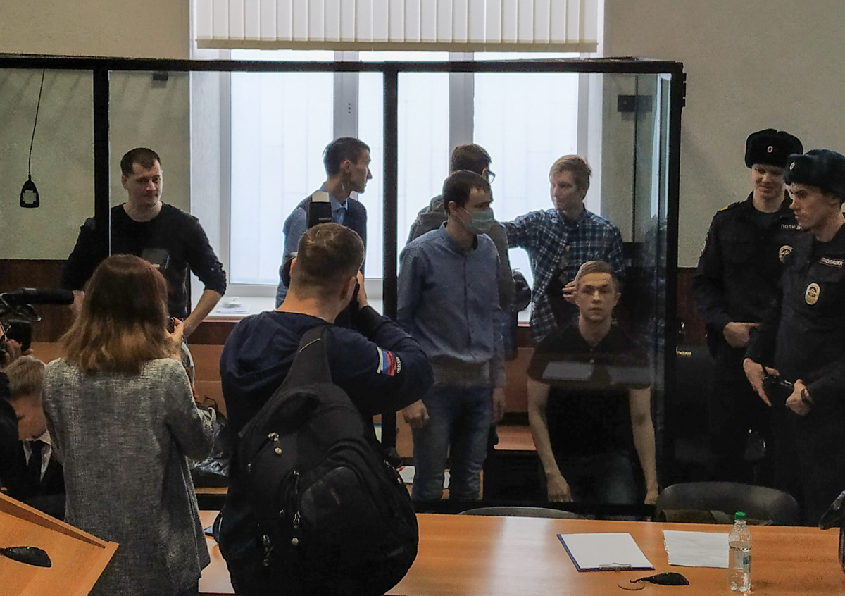 На скамье подсудимых семеро молодых анархистов: 30-летний Андрей Чернов, 23-летний Илья Шакурский, 27-летний Арман Сагынбаев, 31-летний Василий Куксов, 25-летний Михаил Кульков,27-летний Дмитрий Пчелинцев и 25-летний Максим Иванкин.