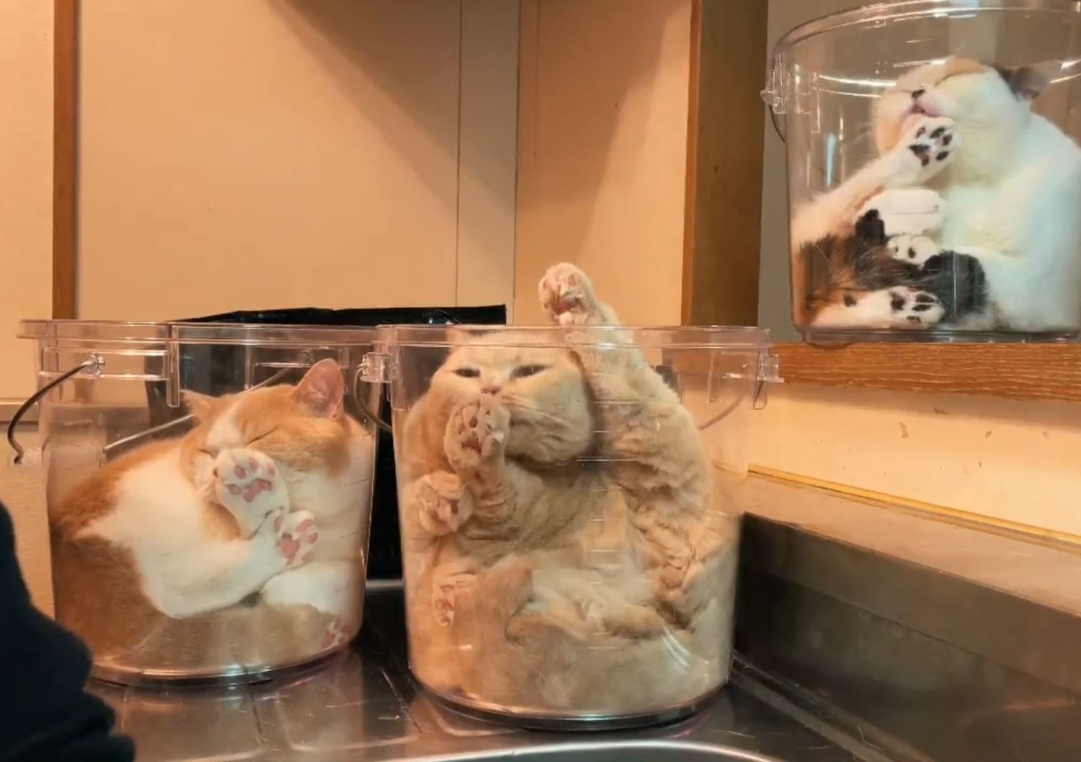 Он пошёл дальше и решил купить прозрачные пластиковые ведёрки. Туда пушистые толстяки тоже влезли. Причём японец устанавливал ведёрки даже на движущихся элементах вроде машинок. Это никак не помешало питомцам залезть в ведро и расслабиться, свернувшись в клубок.