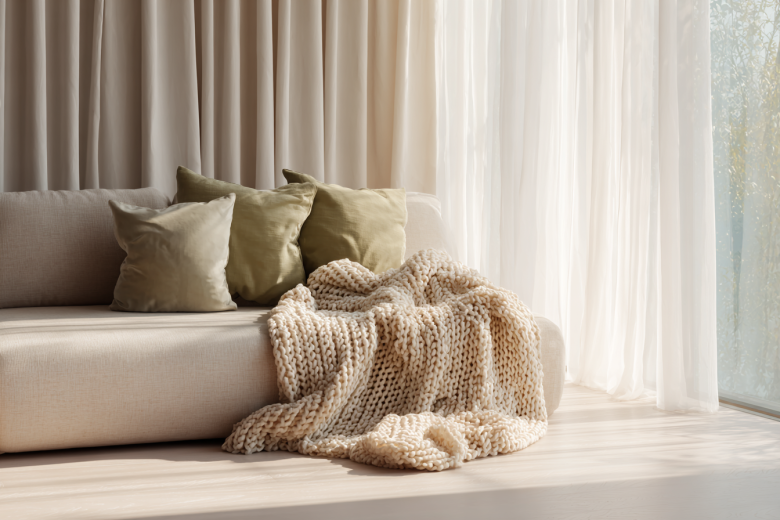 Один из малоизвестных эффектов текстиля — влияние на акустику. Плотные шторы и ковры поглощают звуки, уменьшая эхо. В результате даже маленькая комната начинает звучать «дороже» — исчезает звонкость, появляется мягкая глубина.