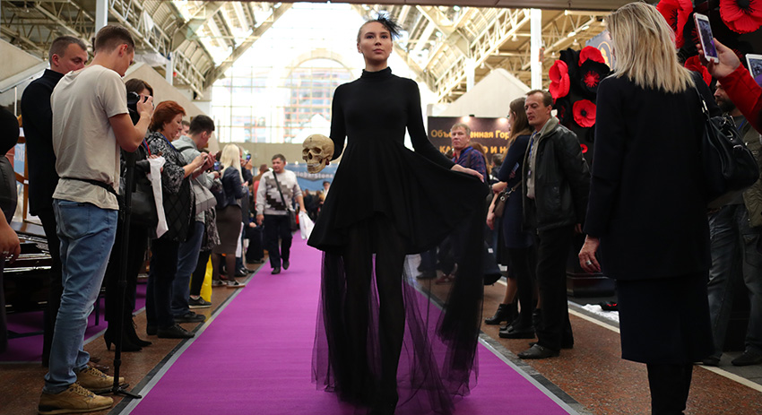 Выпускники Лаборатории Моды Вячеслава Зайцева и еще более десятка российских дизайнеров продемонстрировали траурную одежду на международной ритуальной выставке «Некрополь — TANEXPO World Russia 2018» на ВДНХ. В центре павильона разложили ковровую дорожку — импровизированный подиум. Зазвучала печальная музыка, и первая модель со скорбным выражением лица показалась перед зрителями. Она одета во все черное — закрытое платье из блестящей ткани, колготки, туфли, жакет из неопреновой сетки. Образ дополняют ободок с черными листьями на голове и небольшая вуаль.