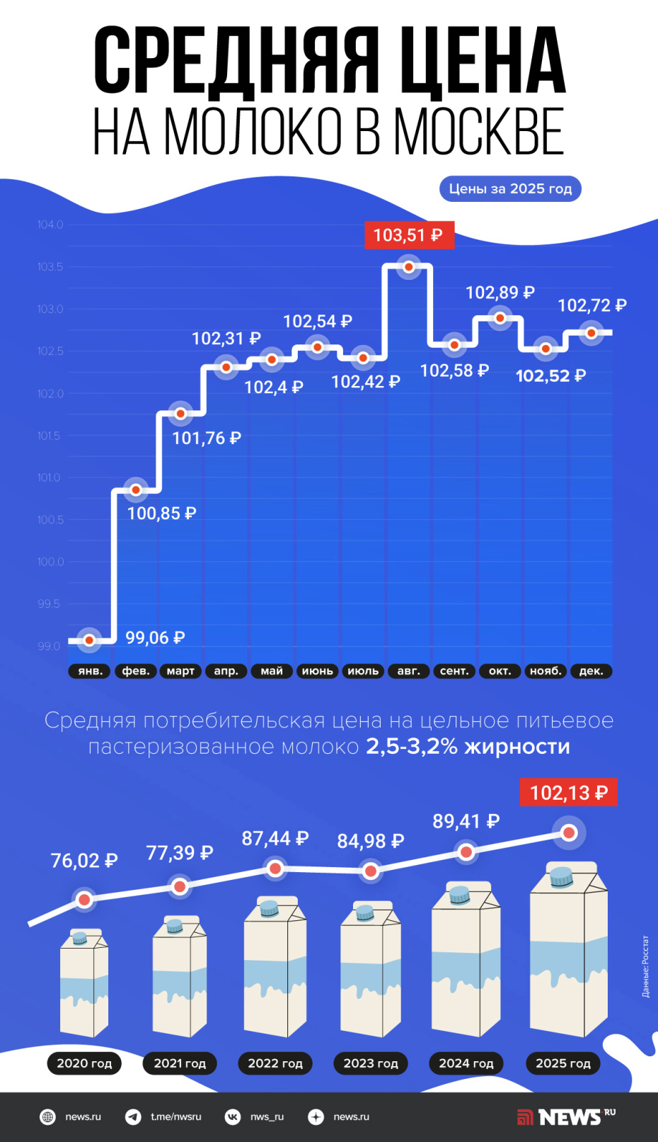 По данным на 19 января 2026 года розничные цены на пастеризованное молоко достигли 98,3 рубля за килограмм, а на ультрапастеризованное — 122,4 рубля. За год они увеличились на 7,9% и 5,1% соответственно. Это относительно умеренный рост, и, по словам Плугова, он как раз связан с рекордным производством в 2025 году.