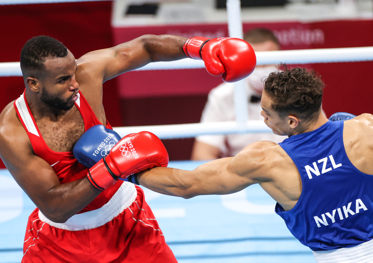 Попытка не увенчалась успехом, боец из Новой Зеландии (в синем) увернулся.