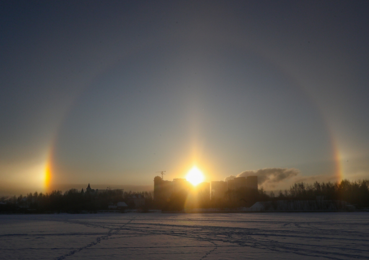 Сегодня, 6 января, москвичи могли наблюдать в небе «три солнца», такой оптический эффект носит название солнечное гало. NEWS.ru публикует снимки редкого природного явления, которое возникает в результате преломления солнечных лучей в кристаллах льда.