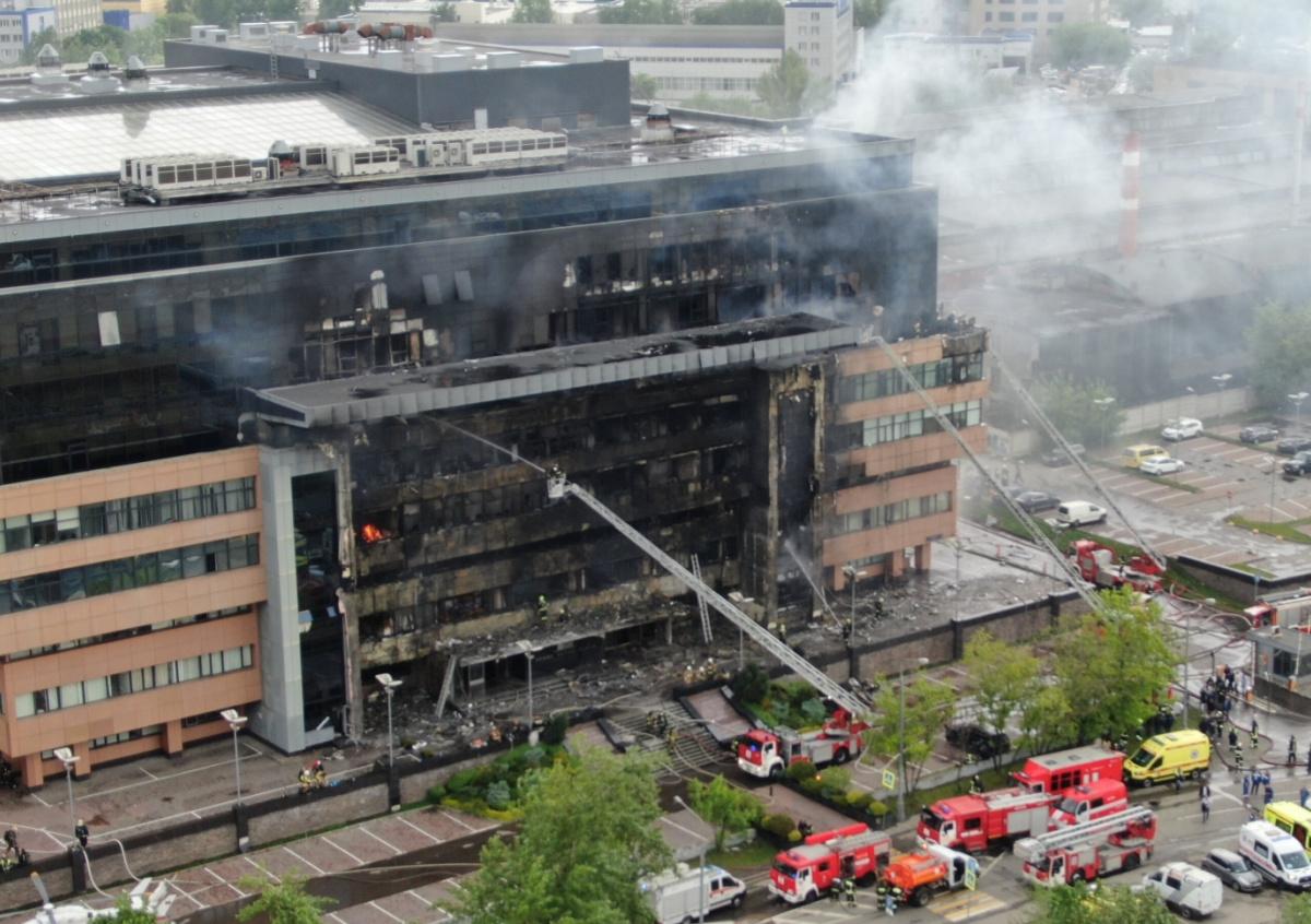 В видеоролике видно обугленный фасад лицевой части бизнес-центра, он полностью сгорел от нижних до верхних этажей. На месте происшествия работали три вертолета и 380 спасателей МЧС.