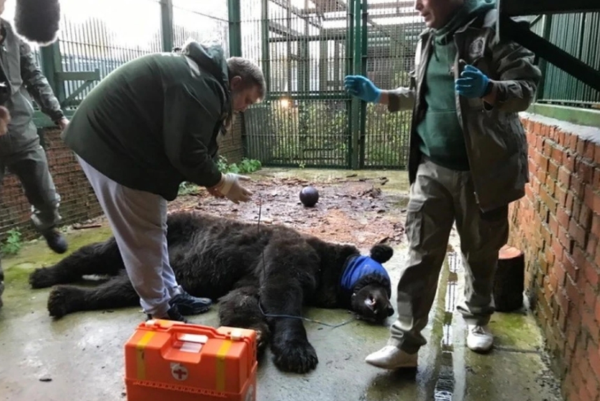 В Московском зоопарке Грому уже провели медосмотр, инсульт пока не подтвердили. Состояние животного оценивается врачами как удовлетворительное, однако медики отметили, что у медведя не хватает нескольких зубов. На новом месте медведь уже облюбовал новый вольер и с наслаждением грызет вкусную косточку.