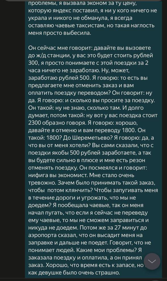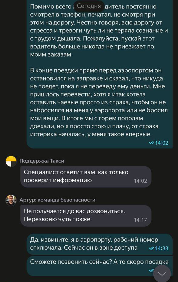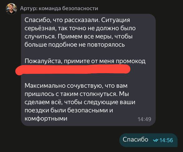 Поездка закончилась истерикой девушки из-за сильного испуга. Она рассказала, что, помимо всего прочего, водитель во время движения постоянно смотрел в телефон. После завершения поездки москвичка обратилась в поддержку «Яндекс Go», где ее выслушали и в качестве извинения прислали промокод.
