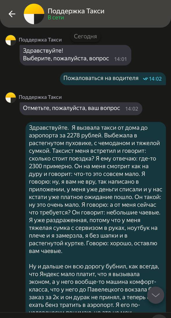 Жительница столицы вызвала такси до аэропорта Шереметьево, заплатив в приложении за поездку свыше двух тысяч рублей. Однако водитель Александр П. назвал сумму маленькой и начал требовать с пассажирки дополнительные средства в качестве чаевых. Мужчина жаловался, что девушка вызвала эконом, хотя его машина комфорт-класса, а также на скромные заработки.