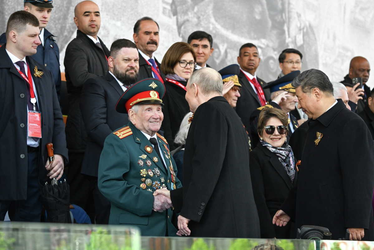 Среди ветеранов войны на центральной трибуне присутствуют освободитель Аушвица Иван Мартынушкин, участник обороны Москвы, артиллерист-разведчик Евгений Знаменский и другие, сообщает ТАСС. Глава государства пообщался со Знаменским перед началом парада. Кроме того, на центральной трибуне присутствуют участники специальной военной операции, а также члены семей погибших бойцов.