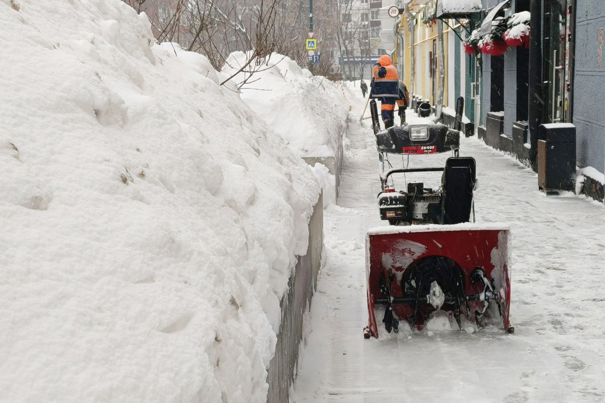 Расчистка тротуара во время снегопада в Москве. По словам синоптиков, более трети месячной нормы осадков выпадет в Москве 27 января