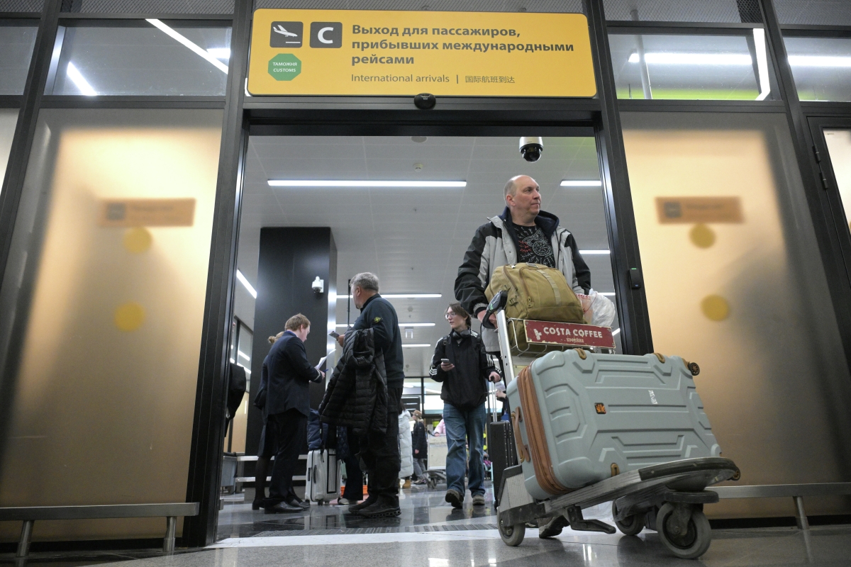 Пассажиры на выходе из зоны прилета международных рейсов в аэропорту Шереметьево в Москве