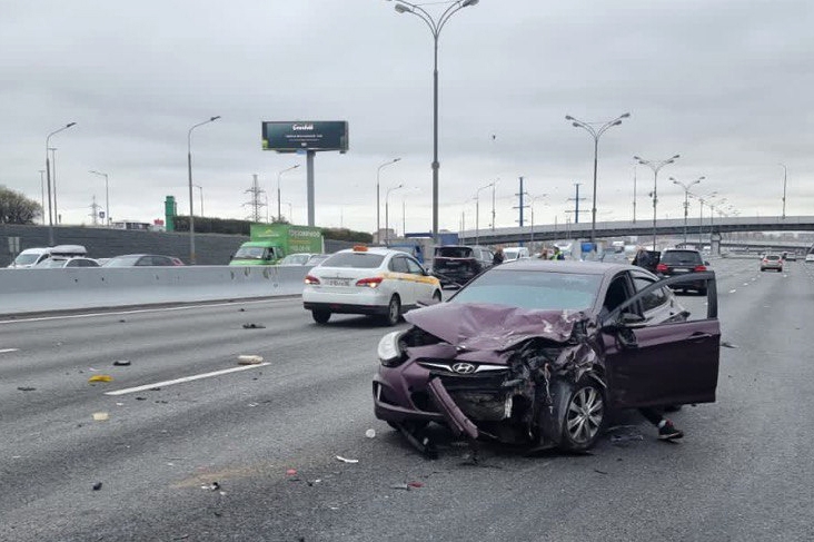 По предварительным данным, <...> водитель автомобиля Hyundai совершил наезд на два транспортных средства, стоящих в крайней левой полосе по причине мелкой аварии, после чего столкнулся еще с двумя автомобилями, — сообщили в Госавтоинспекции Москвы.