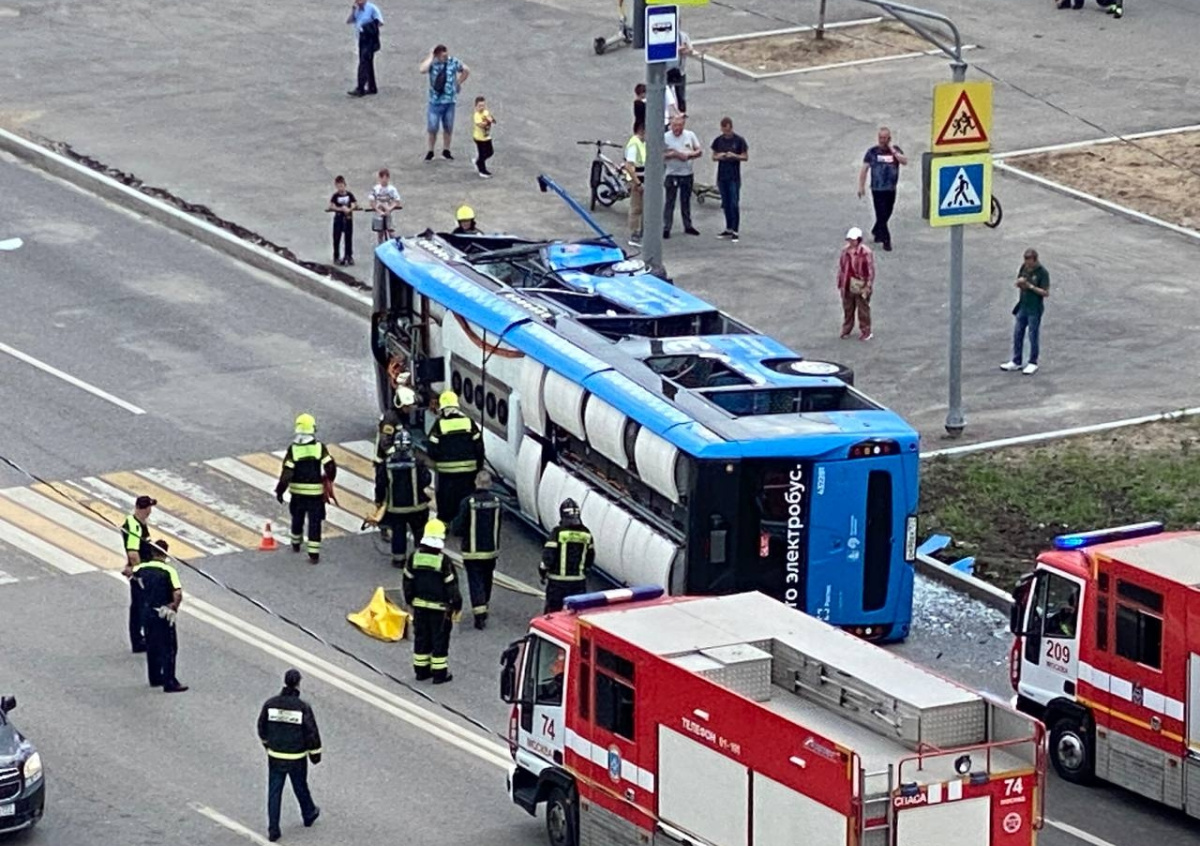 По словам очевидцев, звук падения электробуса был настолько громким, что им показалось, что рухнул дом. К месту происшествия прибыли три кареты скорой помощи. На кадрах, снятых очевидцами, видно, что синий электробус лежит на боку, частично собой закрыв пешеходный переход. Вокруг видны осколки стекла, вероятно, выбитых окон транспортного средства.