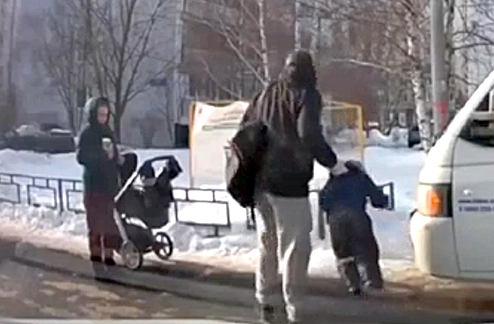 Вместе с ними на прогулку вышла мать с ребенком в коляске. Она никак не отреагировала на выходку главы семейства.