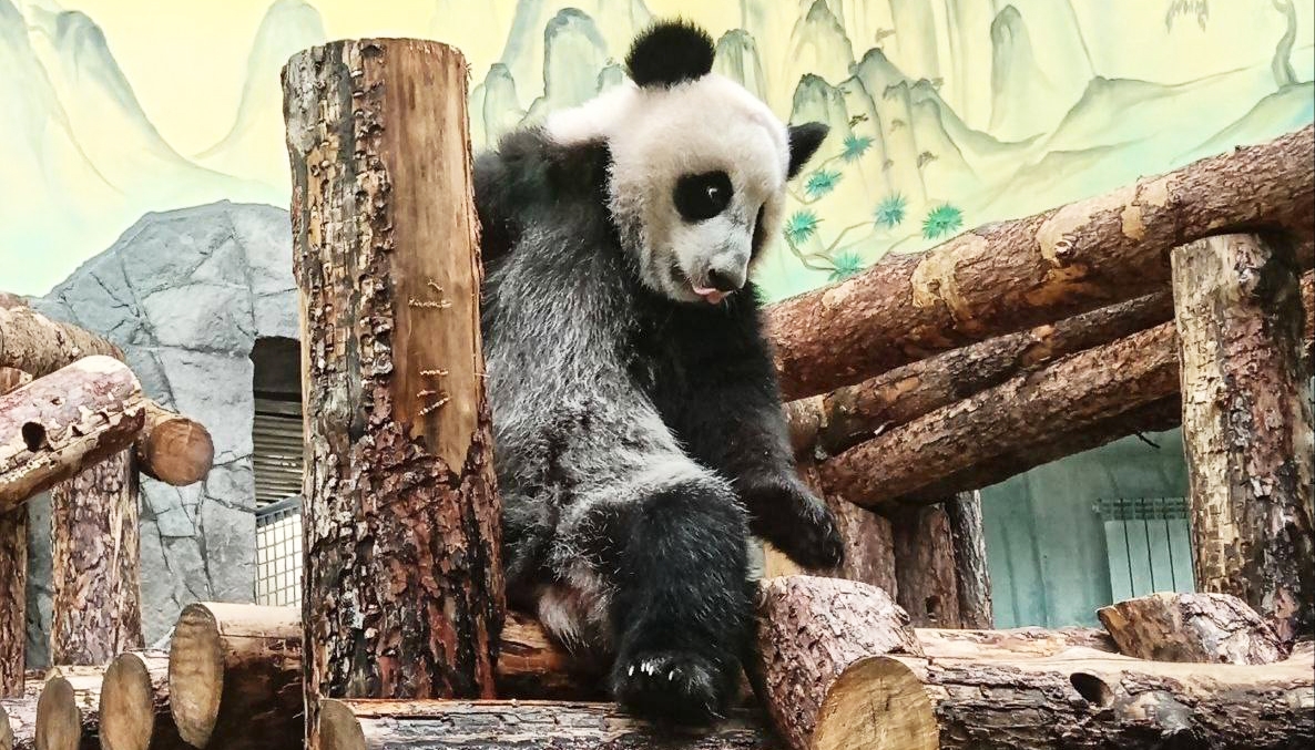 Панда Катюша пролезла в узкую щель между бревнами в уличном вольере