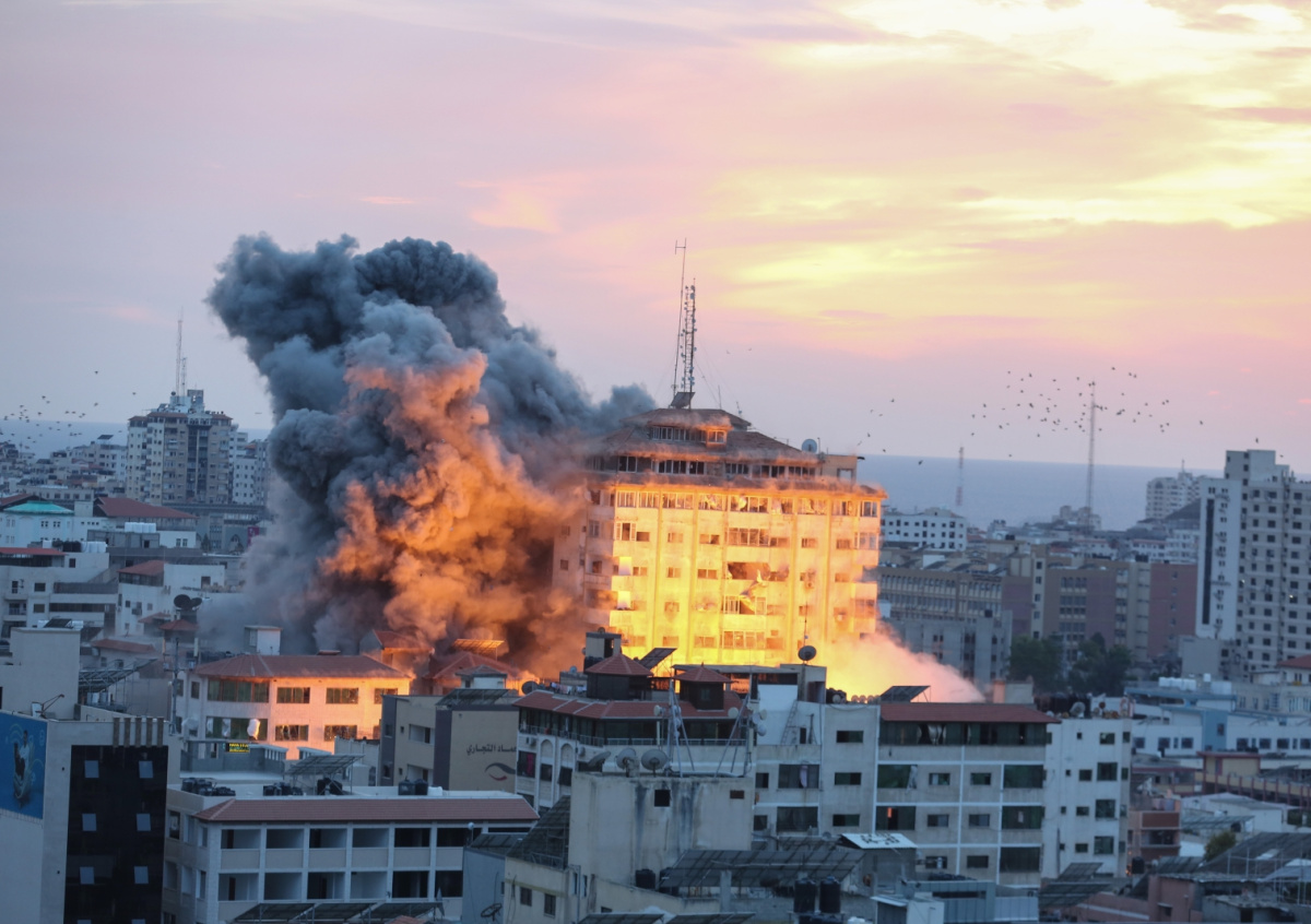 Клубы дыма и пламени после того, как израильские войска нанесли удар по высотной башне в городе Газа