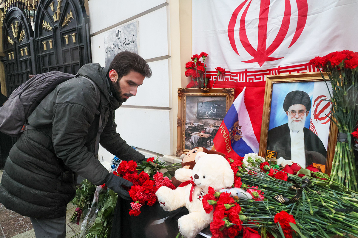 Мужчина возлагает цветы к стихийному мемориалу у посольства Ирана Мужчина возлагает цветы к стихийному мемориалу у посольства Ирана Фото: Алексей Белкин/NEWS.ru