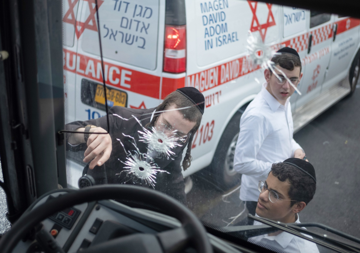 Израиль, Иерусалим: израильтяне смотрят на следы выстрелов на лобовом стекле автобуса после перестрелки на автобусной остановке в Иерусалиме Израиль, Иерусалим: израильтяне смотрят на следы выстрелов на лобовом стекле автобуса после перестрелки на автобусной остановке в Иерусалиме Фото: Ilia Yefimovich/dpa/Global Look Press