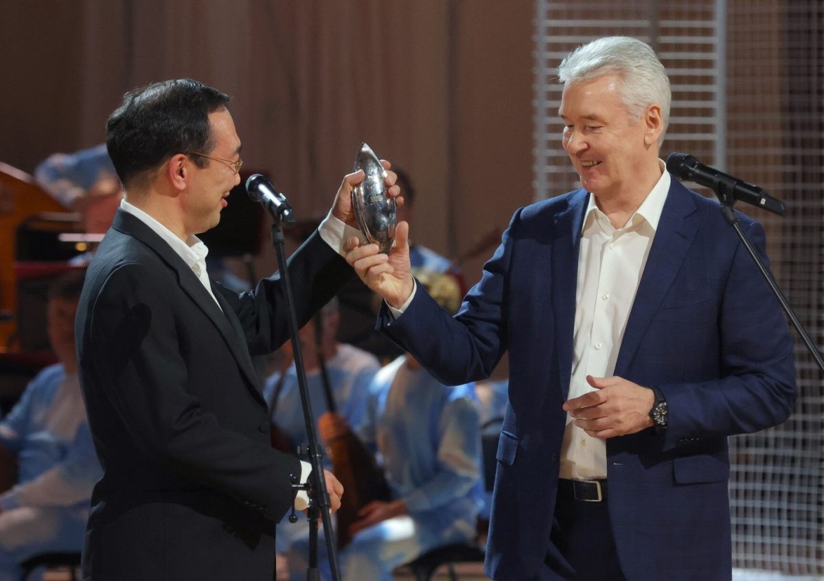 Глава Республики Саха (Якутия) Айсен Николаев, победивший в номинации «Креативный регион», и мэр Москвы Сергей Собянин (слева направо) во время церемонии вручения Российской национальной премии в сфере креативных индустрий Russian Creative Awards