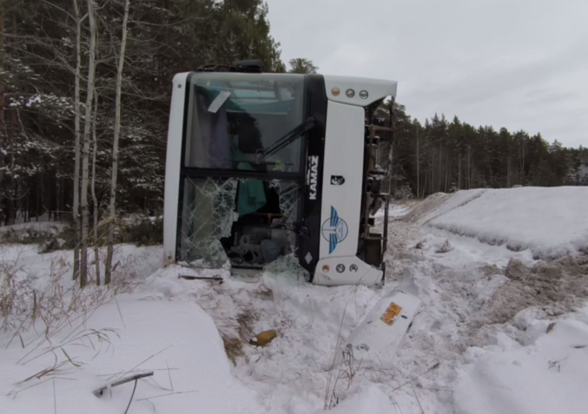 Предварительно, водитель автобуса зацепил снежный вал, автобус съехал в кювет и повалился на бок. В результате аварии все находящиеся в салоне автобуса получили ушибы.