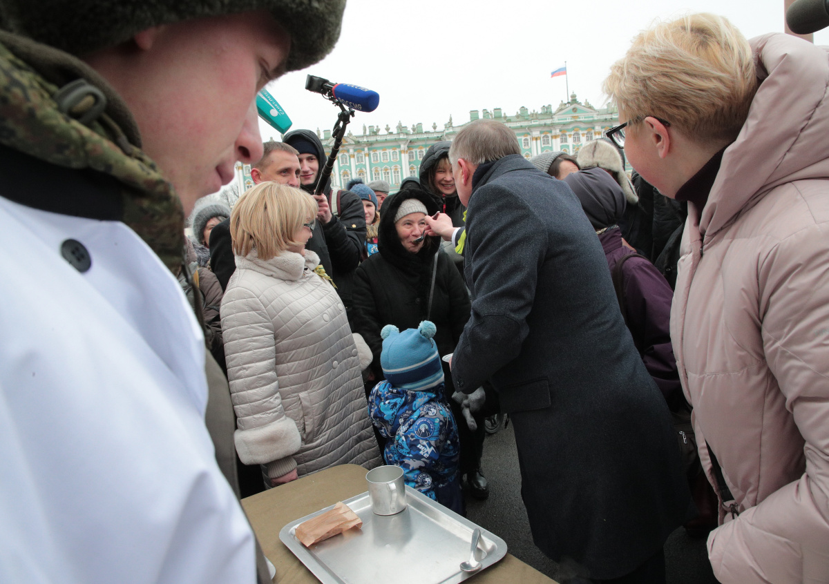 Беглов посетил полевую кухню на Дворцовой площади вместе с группой чиновников и военных. Губернатор попросил чечевицу и гречневую кашу с тушёнкой. Съев одну ложку, он начал кормить собравшихся петербуржцев со своей тарелки.