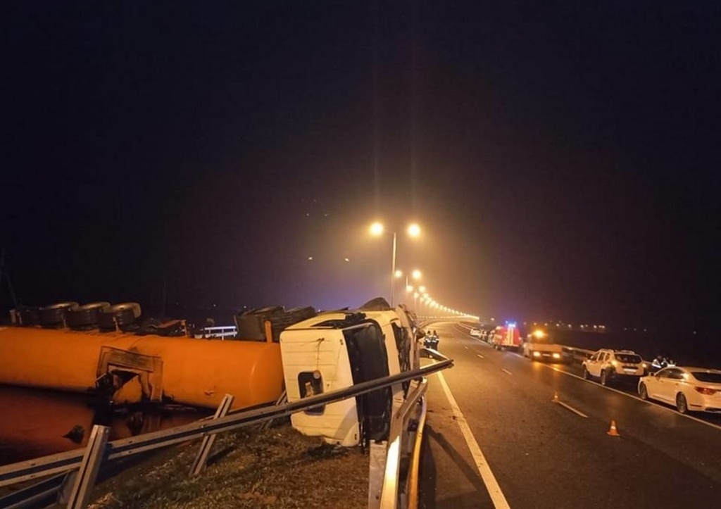 Канал пишет, что трасса перекрыта в направлении Калининграда. В деле разбирается полиция. Пресс-служба УМВД по региону уточняет, что 39-летний водитель, по предварительным данным, уснул за рулем, допустив наезд на дорожное ограждение, из-за чего автоцистерна опрокинулась. ДТП произошло 14 ноября сразу после полуночи. На месте аварии автодорогу перекрыли, со стороны Светлогорска организовали объезд. Сотрудники ГИБДД выясняют обстоятельства происшествия, а сотрудники МЧС занимаются ликвидацией разлива топлива.