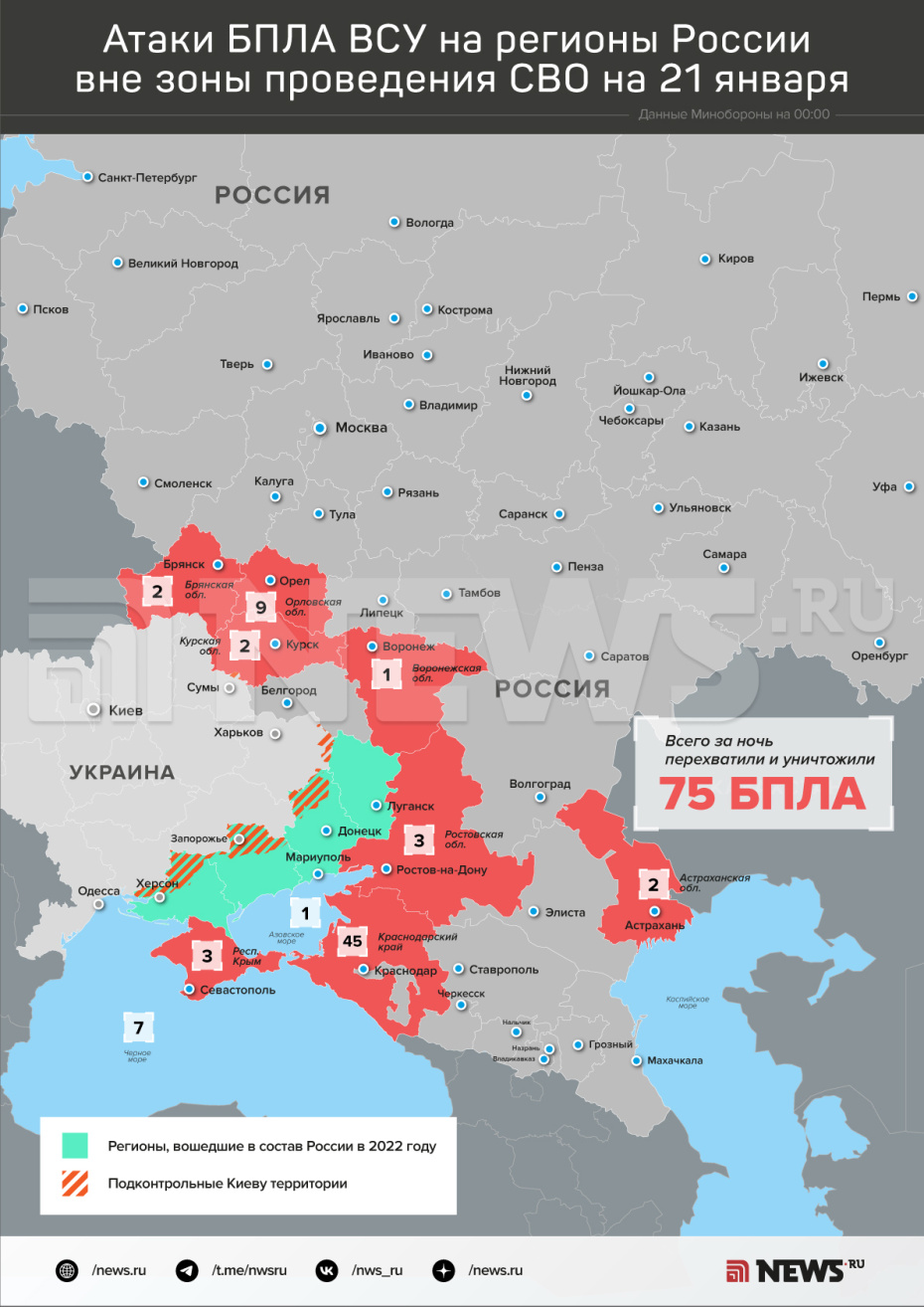 Силы ПВО сбили 75 беспилотников ВСУ над Россией в ночь на 21 января
