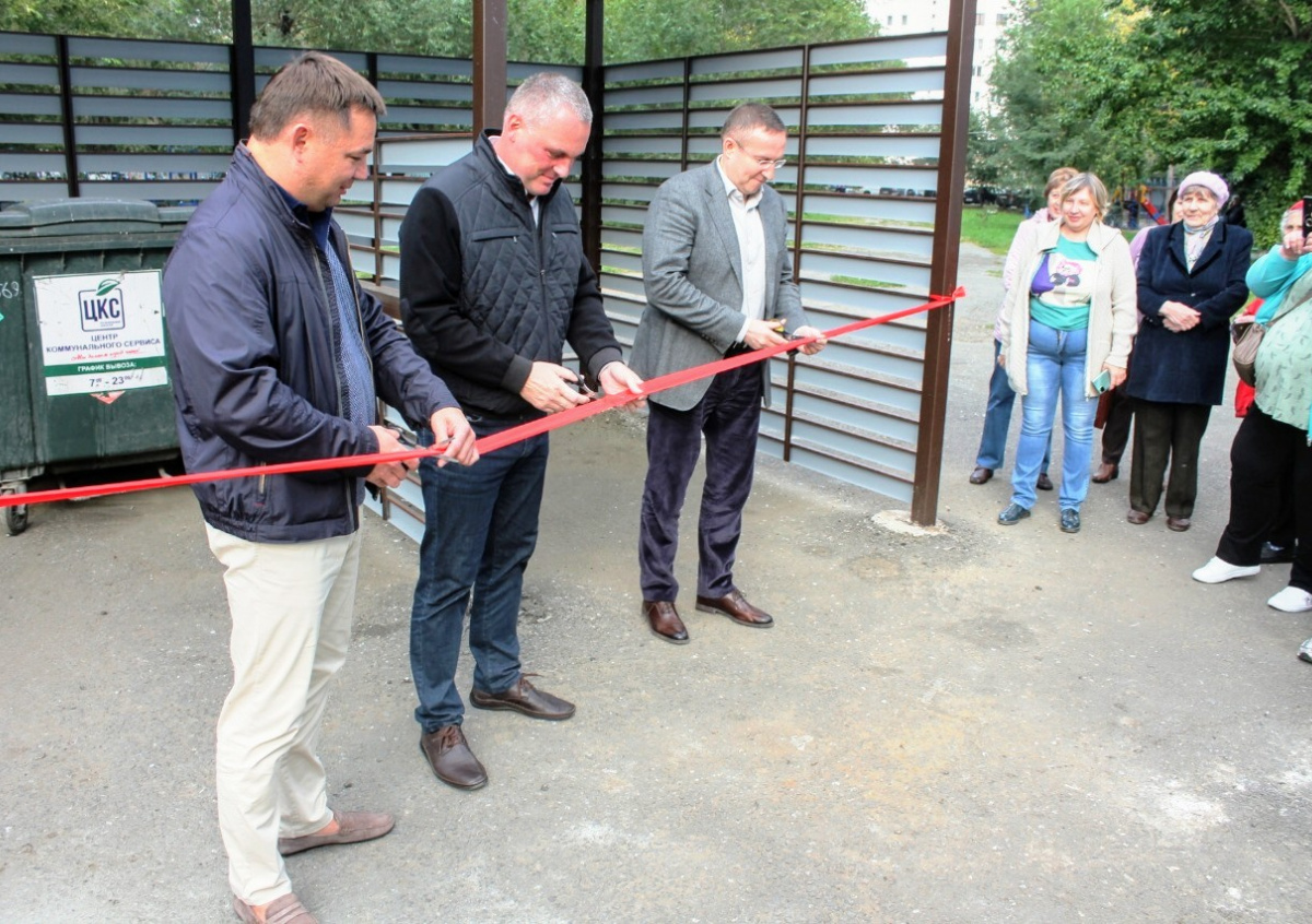 Челябинские депутаты от «Единой России» Сергей Овчинников и Алексей Локоцков, а также замглавы Советского района города Евгений Петров торжественно открыли мусорные контейнеры во дворе жилого дома. Они перерезали красную ленточку у контейнерной площадки.