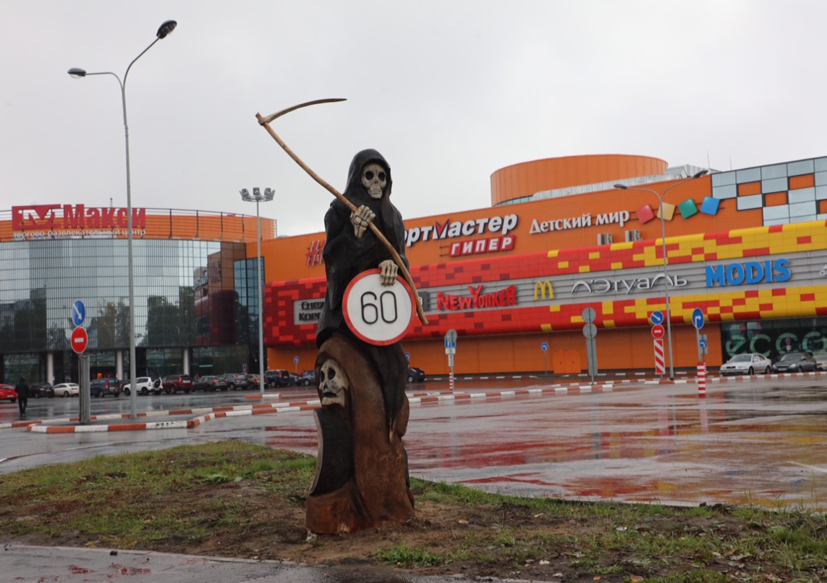 Знак ограничения скорости, который держит фигура смерти с косой, появился в Архангельске и исчез, не простояв и суток. Его установила администрация города.