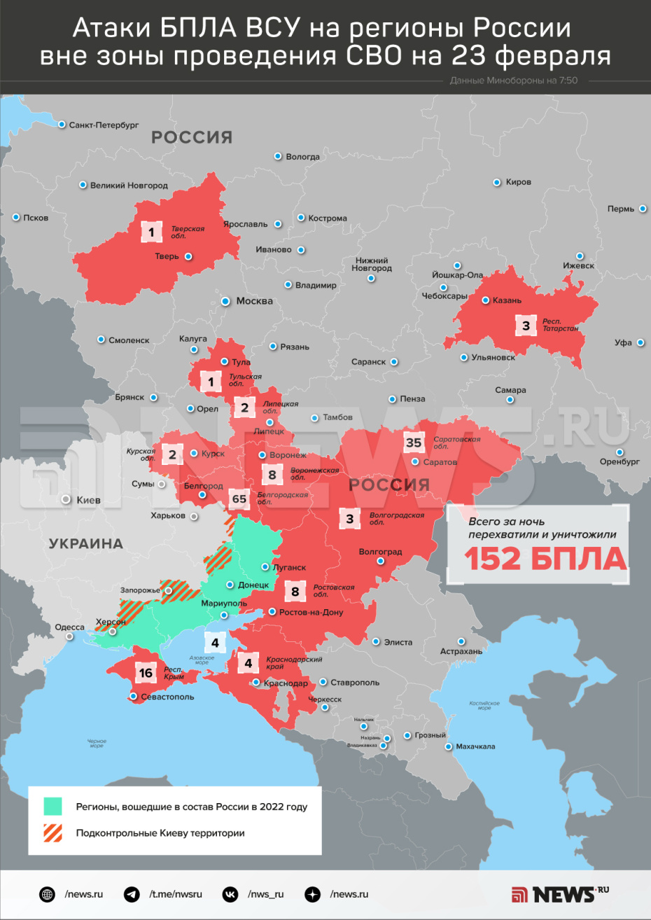 В течение прошедшей ночи с 23:00 мск 22 февраля до 07:00 мск 23 февраля дежурными средствами ПВО перехвачены и уничтожены 152 украинских беспилотных летательных аппарата самолетного типа: 65 БПЛА — над территорией Белгородской области, 35 БПЛА — над территорией Саратовской области, 16 БПЛА — над территорией Республики Крым, по восемь БПЛА — над территориями Воронежской и Ростовской областей, по четыре БПЛА — над территорией Краснодарского края и акваторией Азовского моря, по три БПЛА — над территориями Волгоградской области и Республики Татарстан, по два БПЛА — над территориями Курской и Липецкой областей и по одному БПЛА — над территориями Тульской и Тверской областей, — сообщили в ведомстве.