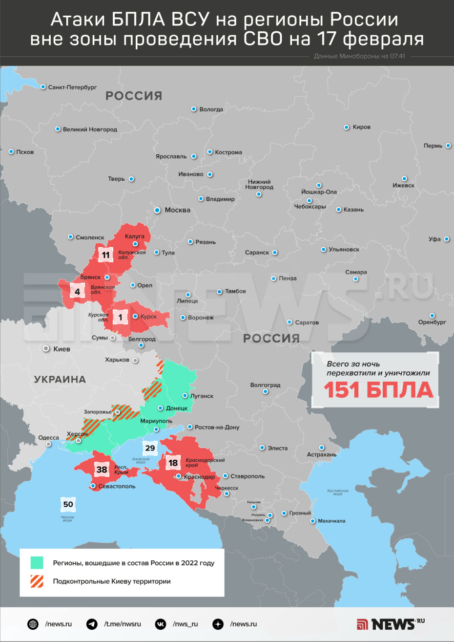 В ночь на 17 февраля Вооруженные силы РФ пресекли попытки украинской армии совершить атаки с применением БПЛА самолетного типа на объекты на российской территории, говорится в сообщении, опубликованном в Telegram-канале Минобороны РФ. Дежурные средства ПВО перехватили и уничтожили 151 дрон противника. Над какими регионами были сбиты беспилотники Вооруженных сил Украины — в инфографике NEWS.ru.