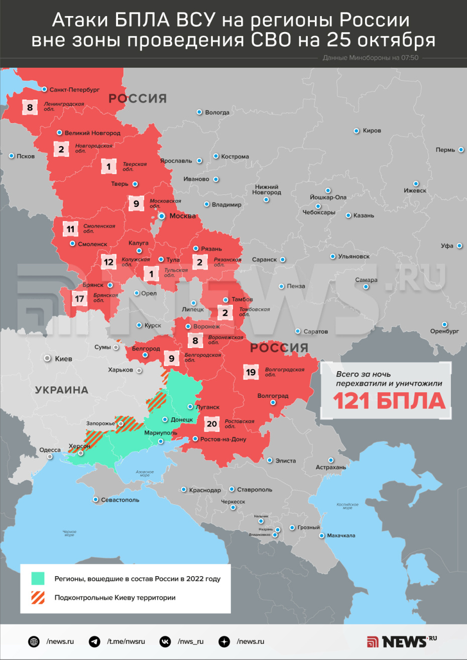 Карта атак БПЛА ВСУ на регионы РФ на 25 октября: инфографика
