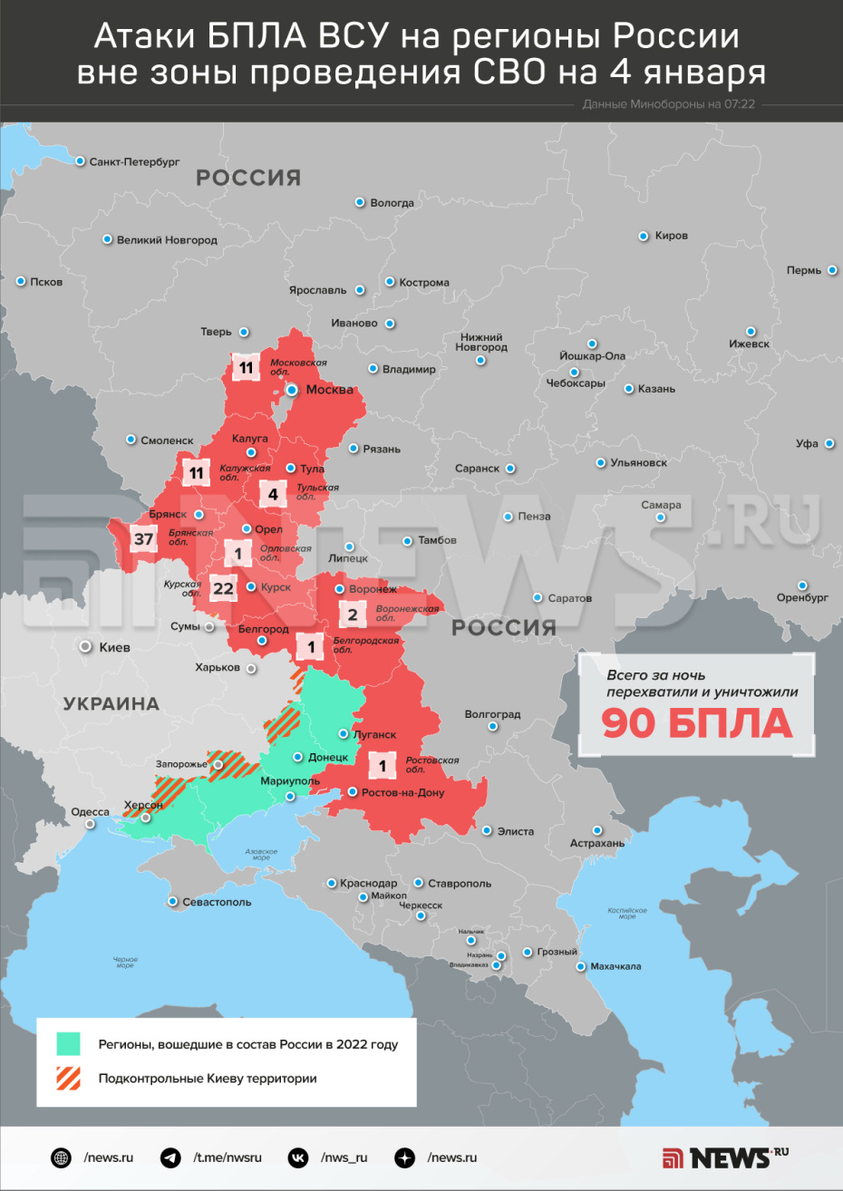В ночь на 4 января Вооруженные силы РФ пресекли попытки украинской армии совершить атаки с применением БПЛА самолетного типа на объекты на российской территории, говорится в сообщении, опубликованном в Telegram-канале Минобороны РФ. Дежурные средства ПВО перехватили и уничтожили 90 дронов противника. Над какими регионами были сбиты беспилотники Вооруженных сил Украины — в инфографике NEWS.ru.
