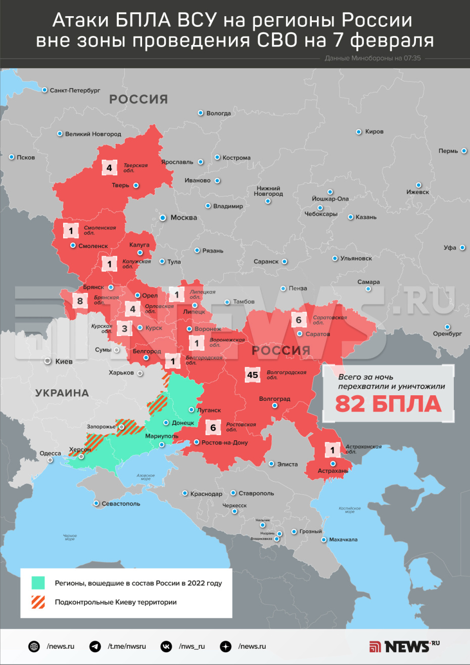 «В течение прошедшей ночи с 23:00 мск 6 февраля до 07:00 мск 7 февраля дежурными средствами ПВО перехвачено и уничтожено 82 украинских беспилотных летательных аппарата самолетного типа: 45 БПЛА — над территорией Волгоградской области, восемь БПЛА — над территорией Брянской области, шесть БПЛА — над территорией Ростовской области, шесть БПЛА — над территорией Саратовской области, четыре БПЛА — над территорией Орловской области, четыре БПЛА — над территорией Тверской области, три БПЛА — над территорией Курской области, один БПЛА — над территорией Астраханской области, один БПЛА — над территорией Белгородской области, один БПЛА — над территорией Воронежской области, одинг БПЛА — над территорией Калужской области, один БПЛА — над территорией Липецкой области и один БПЛА — над территорией Смоленской области», — рассказали в Минобороны.