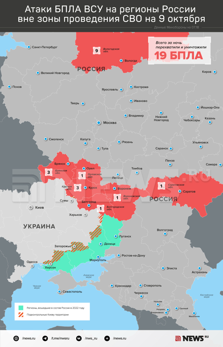 «В течение прошедшей ночи 9 октября дежурными средствами ПВО перехвачены и уничтожены 19 украинских беспилотных летательных аппаратов самолетного типа: девять — над территорией Волгоградской области, по три БПЛА уничтожены над территориями Брянской и Курской областей и по одному — над территориями Белгородской, Воронежской, Орловской и Саратовской областей», — говорится в сообщении.