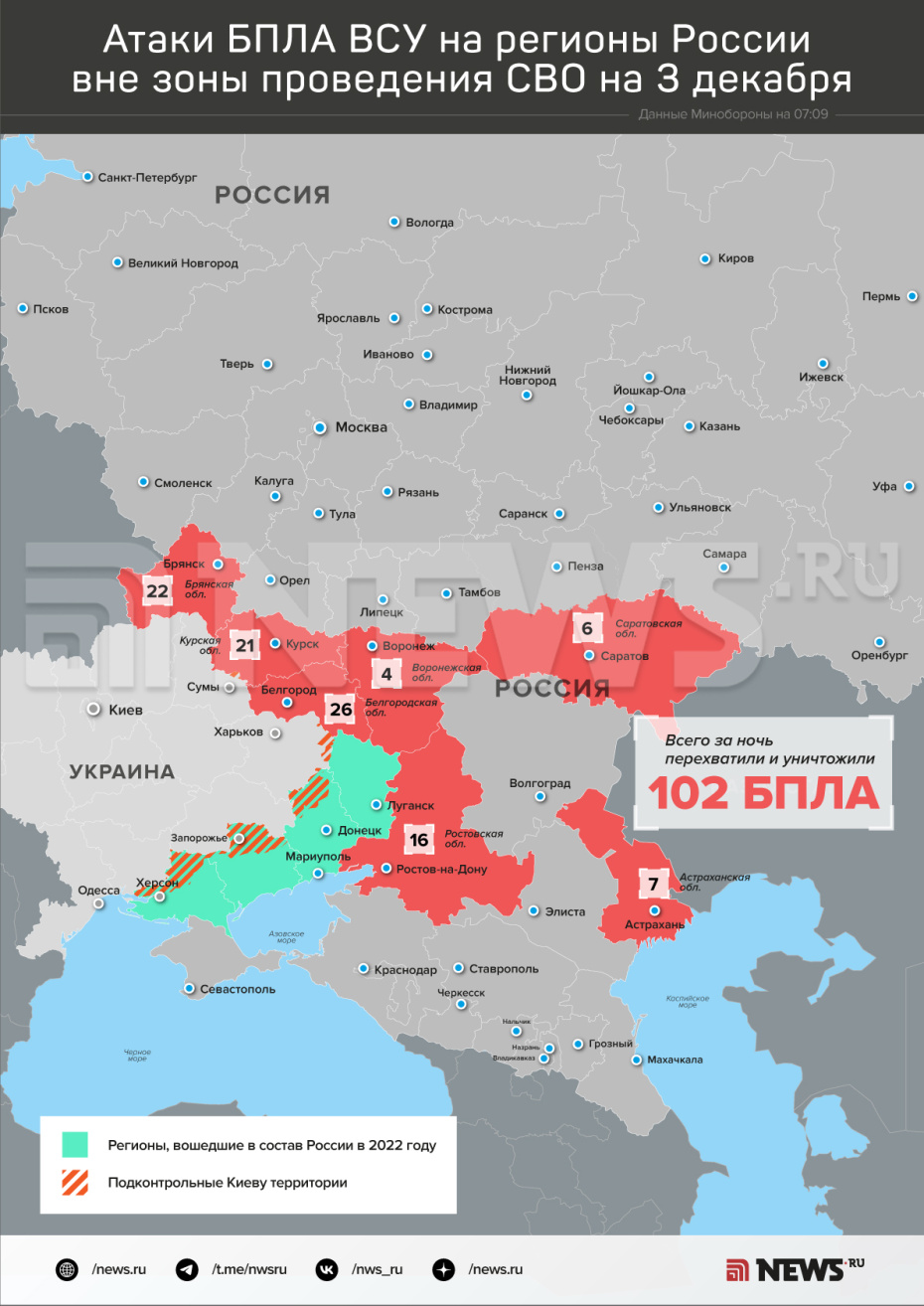 В ночь на 3 декабря Вооруженные силы РФ пресекли попытки украинской армии совершить атаки с применением БПЛА самолетного типа на объекты на российской территории, говорится в сообщении, опубликованном в Telegram-канале Минобороны РФ. Дежурные средства ПВО перехватили и уничтожили 102 дрона противника. Над какими регионами были сбиты беспилотники Вооруженных сил Украины — в инфографике NEWS.ru.