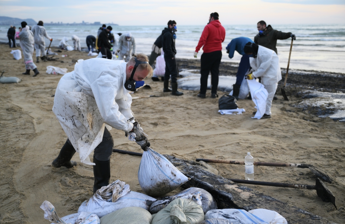 Волонтеры собирают мазут на пляже детского лагеря «Юбилейный» на берегу Анапы Волонтеры собирают мазут на пляже детского лагеря «Юбилейный» на берегу Анапы Фото: Алексей Майшев/РИА Новости