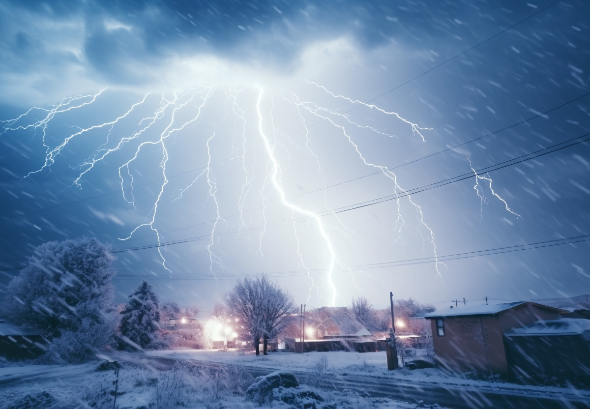 На записи можно увидеть сильный снегопад. При этом в небе сверкает молния, сопровождаемая характерным раскатом грома.