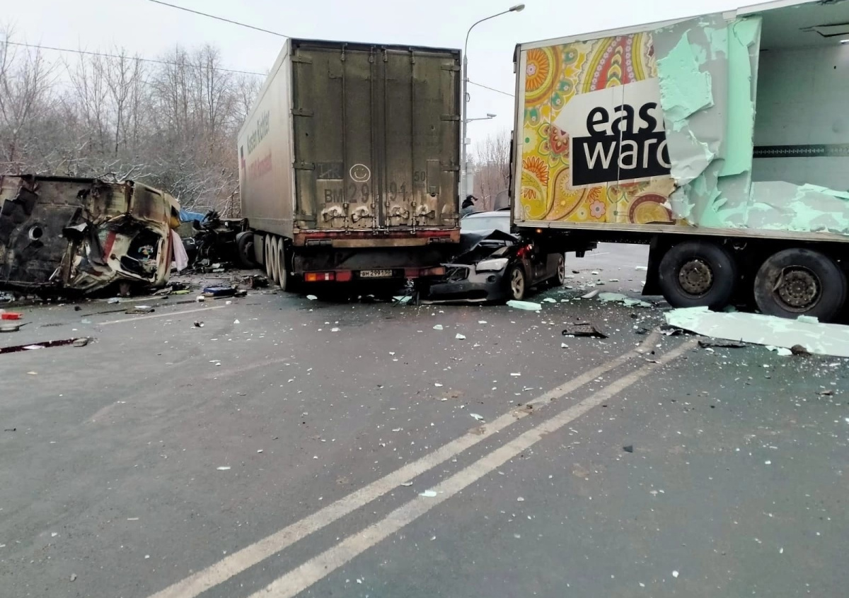 Инцидент произошел в 14:30 на 50-м км трассы М-7 «Волга». По предварительной информации, столкнулись две грузовые машины, из-за чего один из большегрузов выехал на встречную полосу дорожного движения и столкнулся с двумя легковыми автомобилями и одним микроавтобусом.