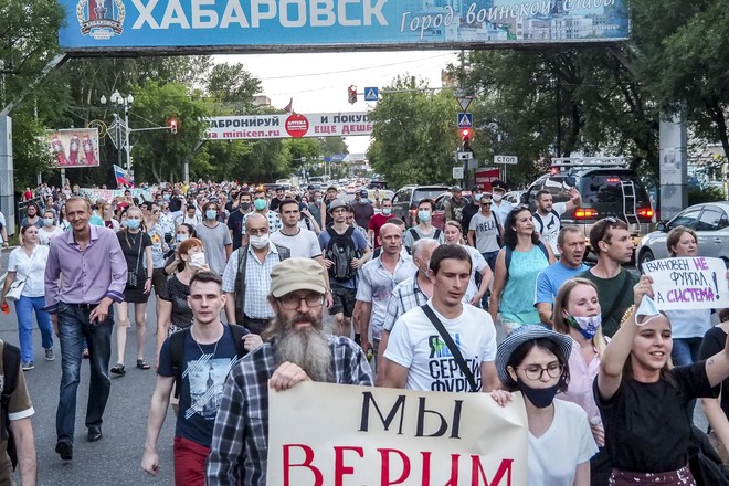 Акции протеста в поддержку бывшего губернатора Хабаровского края проходят уже две недели, с 11 июля 2020 года. Как правило, люди массово собираются в выходные. По разным данным, на улицы выходит от 10 тысяч до 50 тысяч человек.