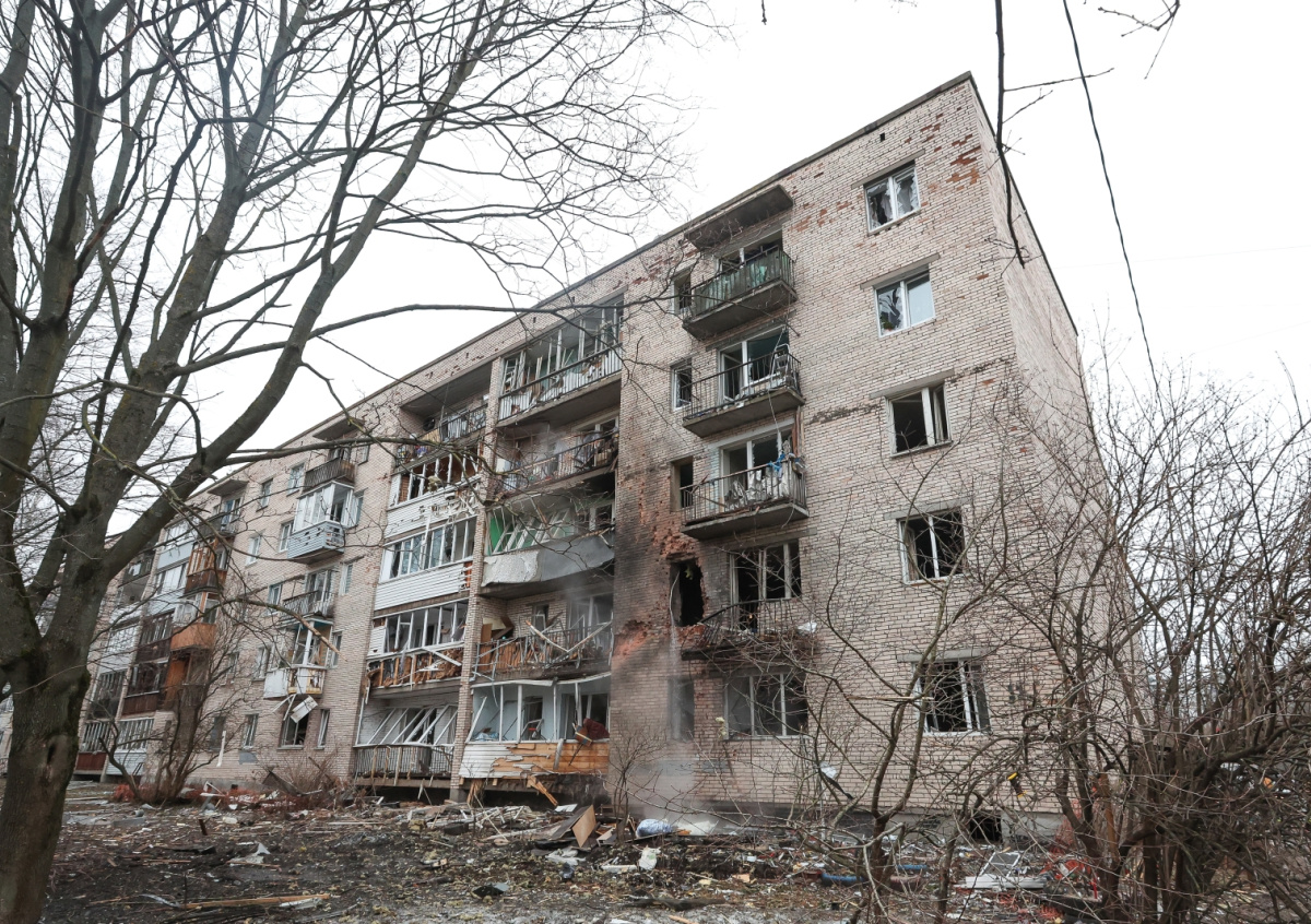 Жилой дом, поврежденный после предполагаемой атаки беспилотника