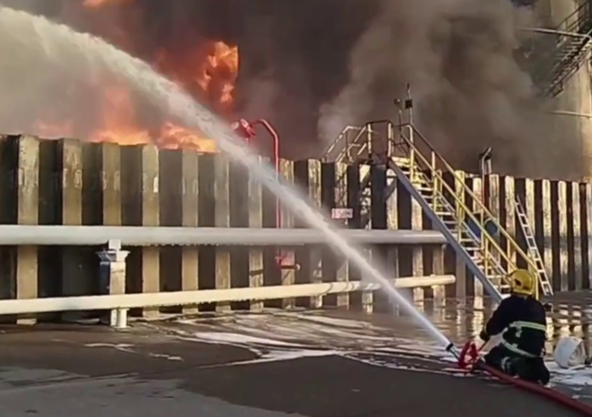 На опубликованных кадрах видно, что пламя целиком охватило резервуар, над ним поднялся столб черного дыма. Сотрудники МЧС заливают огонь водой из шлангов.